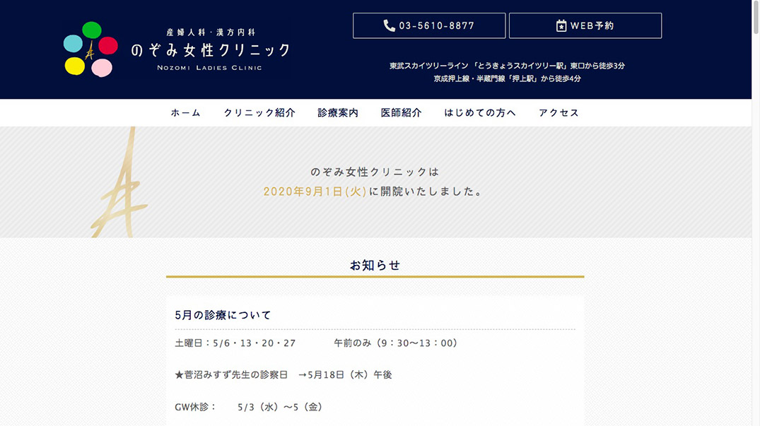 | 営業時間 | 午前:09:30-12:30 午後:14:30-17:30 土 午前:9:30〜13:00 のぞみ女性クリニック「診療受付時間」より引用 |